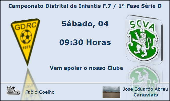 Na próxima ronda dia 04-02-2012, a equipa do G.D.R. Canaviais irá receber no Campo José Eduardo Abreu a equipa de infantis do Sporting de Viana onde o empate ou a vitória fará com que a nossa equipa transite para a fase de apuramento de campeão e assim jogar no leque das melhores equipas deste campeonato, assim convidam-se todos os simpatizantes a apoiar a nossa equipa em mais um jogo.